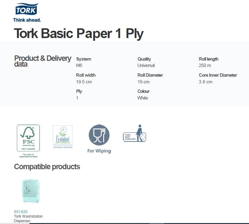 The Tork Paper Wiper is designed for optimal dispensing from the Tork Washstation Dispenser System. HACCP International certification ensures that this product is safe for use in food processing and food preparation areas. 130001 Tork Basic Paper 1 Ply Extra-long roll for high-volume food processing environments – less maintenance saves time. Paper designed for wet environments, efficient even in high humidity, ensuring convenience and saving time Food-contact-certified rolls is a guarantee of high-quality paper and product safety Bundles can be topped up easily to avoid paper run-outs