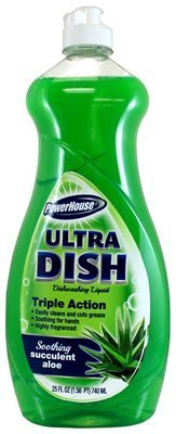 PowerHouse Succulent Aloe Ultra Dish Dishwashing Liquid, 740mL, Soft On Hands, Special Formula Provides Long Lasting Suds That Leave Your Dishes Sparkling Clean, Biodegradable Cleaning Agents, Safe For Septic Tanks. PowerHouse Succulent Aole Dish Liquid combines powerful grease-cutting suds and a fresh green scent. This aloe enhanced formula is gentle on hands and makes cleaning dishes easy. This is TrueValue American Product. Triple Action , Easily cleans and cuts grease, Gentle on hands, Highly fragranced Eye Irritant. If eye contact occurs, flush eyes with water for at least 15 minutes. If SWALLOWED, drink a glss of water to dilute. Contact a physician promptly. Keep out of reach of children. DO NOT USE IN AUTOMATIC DISHWASHERS. DO NOT MIX WITH CHLORINE BLEACH: This dish detergent in not tested on animals. Biodegradables Cleaning Agents. Safe for septic tanks. Contains No Phosphorus.