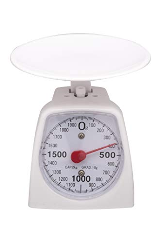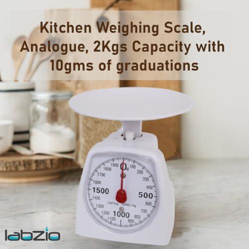 Compact and easy-to-read analogue scale for weighing in the kitchen, lab, or crafts. With 10g graduations and a 2kg capacity, this scale provides reliable, precise measurements for various uses, including scientific experiments and cooking.