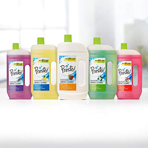 Introducing the new Presto! Disinfectant Surface & Floor Cleaner in a refreshing Lavender fragrance. Keep your home fresh and germ-free with this powerful formula that kills 99.99% of germs. This surface cleaner is suitable for various surfaces such as floors, ceramic tiles, kitchen counters, and bathroom sinks. Tackle tough stains with ease, including coffee, ketchup, soy sauce, mustard sauce, olive oil and more. This all-purpose cleaner is also gentle on your hands, making it easy to use without worrying about any harsh chemicals. For lightly soiled areas, mix Presto! with water for optimal cleaning results. For heavily soiled areas, use the undiluted product for maximum effectiveness. After use, enjoy the lingering scent of lavender that leaves your room smelling fresh and clean. Post 5 minutes of contact with the undiluted product, Presto! Disinfectant Surface & Floor Cleaner formula effectively eliminates germs on various surfaces such as ceramic, marble, granite and mosaic. Get ready to experience a deep clean like never before with Presto! Disinfectant Surface & Floor Cleaner in Lavender fragrance.