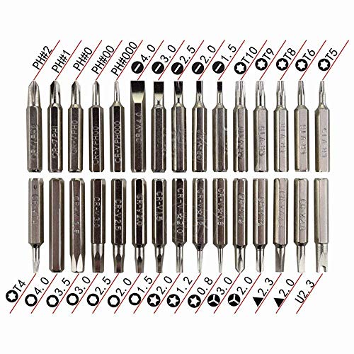 Cable World 30 Micro Tips: Torx: T4, T5, T6, T8, T9, T10. Slotted: 1.5, 2.0, 2.5, 3.0, 4.0. Phillips: PH000 PH00 PH0 PH1 PH2. Hex: M1.5, M2.0, M2.5, M3.0, M3.5, M4.0. Stars: 0.8, 1.2, 2.0. Triangle: 2.0, 2.3. Tri-wing bits: Y2.0, Y3.0. U: U2.3. Cable World