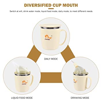 cup + cap: can be used as an ordinary cup.cap+straw+straw head:can drink water,juice etc.don’t need to tip up to drink.cap + suction nozzle : can drink liquid food,such as porridge etc.