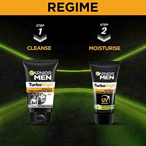 Garnier Men Anti-Pollution Brightening Moisturiser has a light weight formula that is invisible on skin. Lemon extracts brighten dull skin while green tea protects from pollution. UV filters protects from sun. Apply twice on the whole face daily after thorough cleansing with Garnier Men PowerWhite Duo FaceWash. Avoid eye contour. Not to be used by children under 3 years of age. Garnier Men is India’s No.1 Men’s FaceWash Brand* PRODUCT FEAUTURES: 1. Enriched with goodness of Lemon & Green Tea 2. UV filters to provide all day sun protection 3. Light Weight Formula 4. Invisible on skin 5. Brightens dull skin & protects from pollution