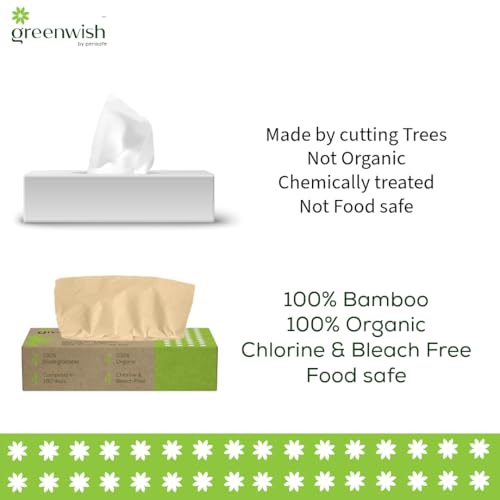 100% Bamboo, 0% Trees: Our tissues are crafted entirely from bamboo, making them a sustainable and eco-friendly choice. Biodegradable: These tissues break down naturally and composts in 180 days, reducing environmental impact. Chlorine & Bleach-Free: Safe for you and gentle on the environment, our tissues are free from harsh chemicals. Thus making safe for sensitive skin and food safe. Thoughtfully Made: Designed with care and a commitment to the planet, Greenwish Bamboo Tissues are perfect for everyday use.