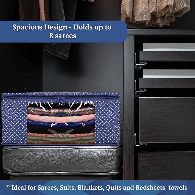 Good storage capacity- can store upto 8 sarees.Large front window- to instantly know what is kept inside.2 premium zippers- for easy opening and closing and to give the bags long life.Quilted from all the sides- to give a cushion to whatever is stored inside.Cotton breathable fabric- to keep your stuff inside free from dust, dirt, moisture and foul smell.