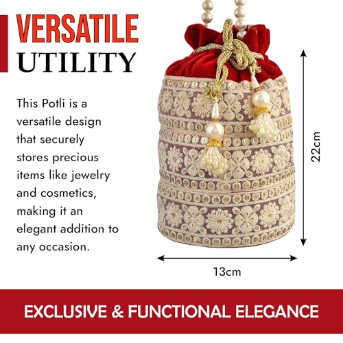 💛 EXCLUSIVE & FUNCTIONAL ELEGANCE : The Potli holds an exclusive that effortlessly combines style with practicality, Unique Potli stands out for its ability to blend elegance seamlessly with practical use, making it a standout choice for those who appreciate both style and usefulness in their accessories. Potli makes it perfect for storing jewellery, cosmetics, keeping them safe and organized. The intricate designs and graceful materials add a touch of sophistication to any outfit or occasion.