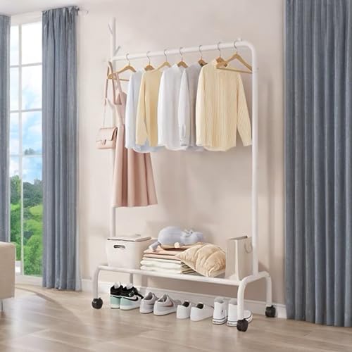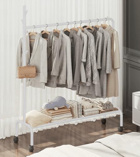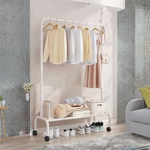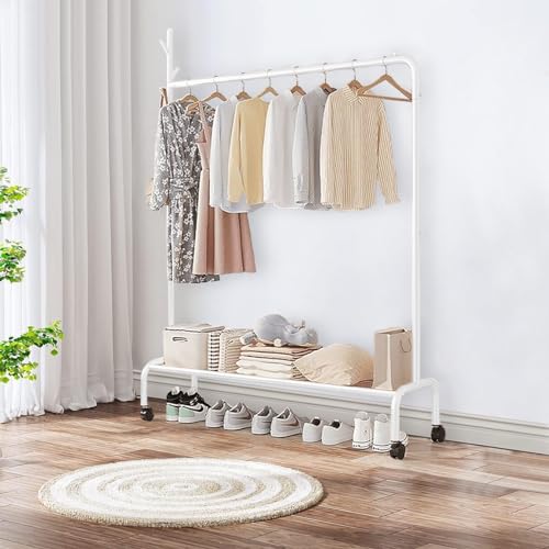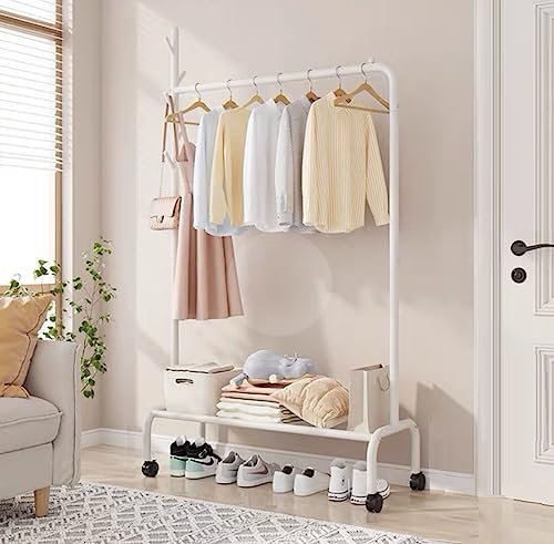 Lukzer Multipurpose Heavy-Duty Single Pole Metal Garment Stand with Wheels 1 Bottom Shelf Clothing Rack Cloth Storage Organizer (172 x 120 x 34cm/White)