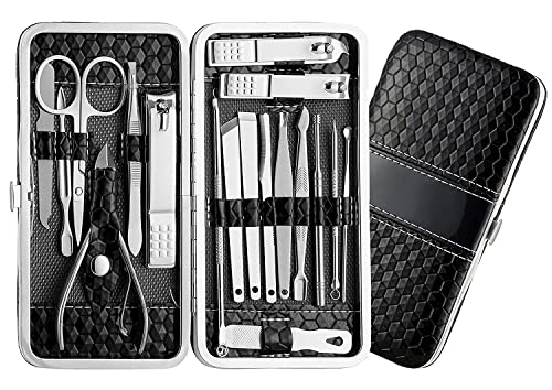 The professional Manicure Kit contains 18 tools for hand care, facial care and foot care, which meets all your needs for comprehensive grooming daily (No need to pay for single nail clippers for finger and toenails, nose hair/eyebrow scissors, cuticle nippers, tweezers etc. separately, thus money will be much saved!) With these sharp tools you can cut the thick nails, dead skin,body hair easily and comfortably.