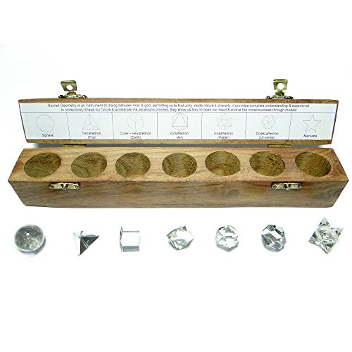 Nestled in their own compartment in a special wooden case with an identification label for each shape. 7 Pcs Set includes the Sphere, Tetrahedron, Hexahedron, Icosahedron, Octahedron, Dodecahedron and Merkaba.