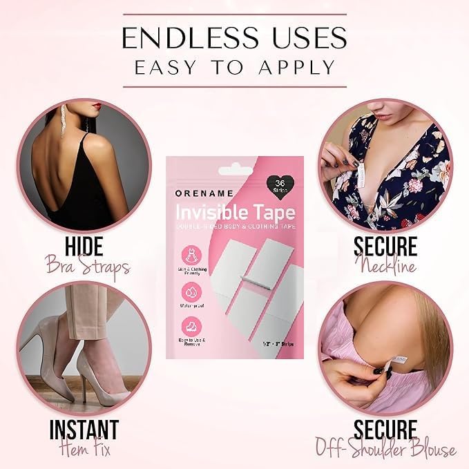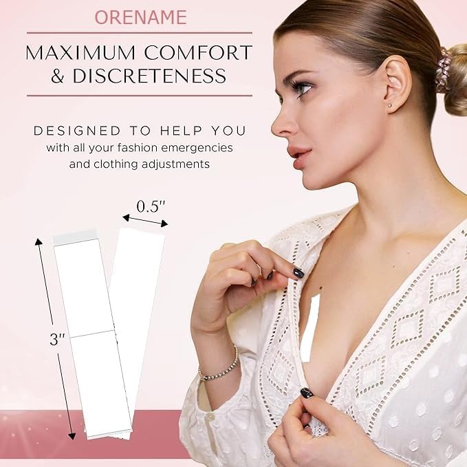 ORENAME Clothing Tape is the ultimate double-sided tape for your body and clothing to keep you looking fabulous all day long! Whether you are going out on a night on the town, it is your wedding day, or you are wearing your favorite new outfit that is almost perfect, Fearless Tape will keep you looking your best. Fearless Tape is perfect for: