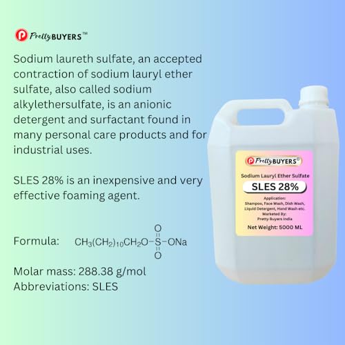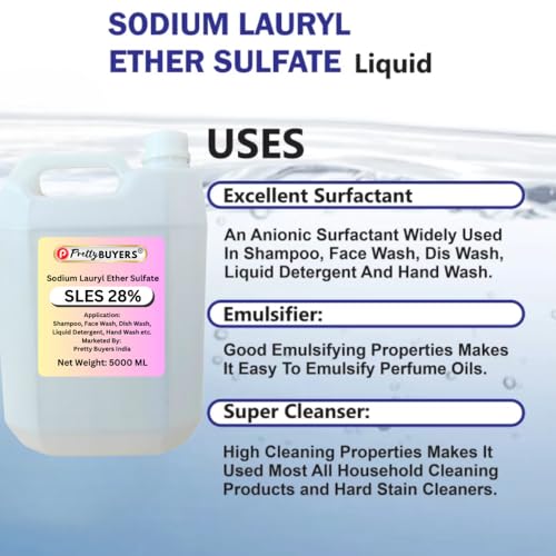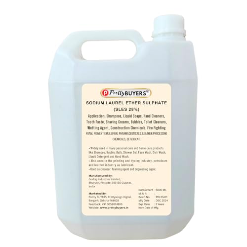 Pretty Buyers SLES 28% is a versatile cleaning solution that serves as a key ingredient in various personal care and household products. This 5000 ml container of Sodium Lauryl Ether Sulfate offers excellent foaming and cleansing properties, making it suitable for multiple applications. Whether you’re formulating shampoo, face wash, dish wash solutions, liquid detergents, or hand wash products, this concentrated 28% SLES solution provides consistent results. The large container size is ideal for both small-scale product development and regular household use. The clear liquid formulation ensures easy mixing and handling during application. This multi-purpose cleaning agent helps create effective cleansing products that can remove dirt, oil, and other impurities. Store in a cool, dry place and handle with appropriate care as per standard chemical safety guidelines.