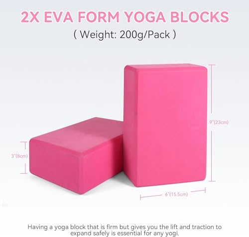 2 Pack Yoga Blocks, 9″ x 6″ x 3″ The solid foam blocks have rounded edges and enough give to support comfortably in any posture. The yoga blocks can be used on any side to flex the height your need.