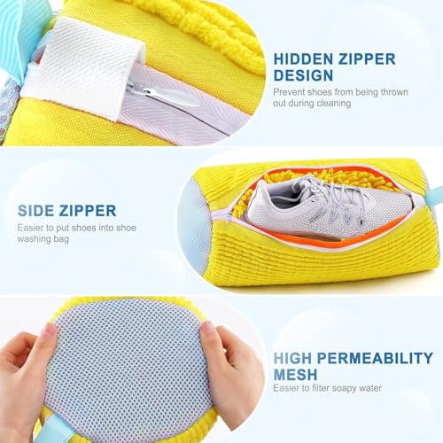 【Upgrade 20000+Fluffy Fibers & Sandwich Mesh】This shoe washing bag is made of a composite structure fabric of sandwich mesh and 20000+ fluffy fibers. The chenille fabric has a weight of 1450gsm, a color fastness of grade 3 or above, and the pile column is thickened and lengthened to 1.2 inch, which have much better cleaning effect than only mesh fabric. The top and bottom are made of sandwich mesh fabric, so the soap water can easily flow through the mesh, achieving the best cleaning effect.