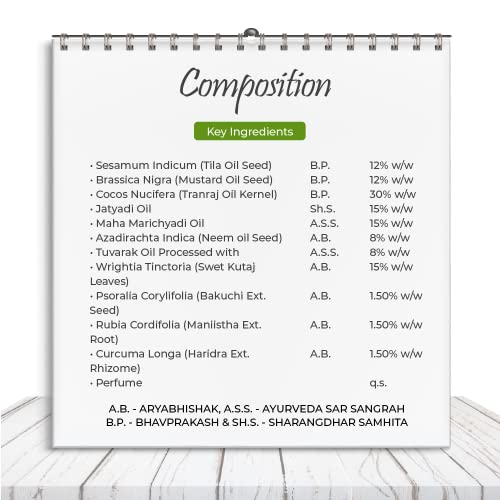 Ingredients: Swet Kutaj, Tila Oil, Jatyadi Oil, Neem Oil Special Ingredient: Jatyadi Oil, Swet Kutaj Leaf Product Benefit: Enhances skin hydration, soothes irritation, and provides antiseptic and calming properties. Application Recommendations: Clean and dry the area with lukewarm water, then apply the oil. Use as needed.Allergen Information | Safety Warning: Consult a healthcare professional if you have concerns or questions about using this herbal product.